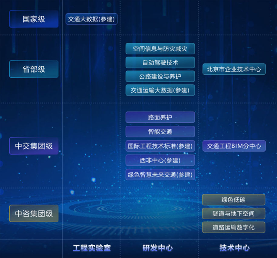 中咨集團一直秉承“追求卓越、敢為人先”的創(chuàng)新精神,深入實施創(chuàng)新驅(qū)動發(fā)展戰(zhàn)略,積極開展交通強國試點任務(wù)、科改示范行動。承建了空間信息應(yīng)用、智能交通、智慧養(yǎng)護方向的交通運輸部行業(yè)研發(fā)中心,6個中交集團研發(fā)中心,自主成立3個中咨級專業(yè)技術(shù)中心,打造“四級三類”科技創(chuàng)新平臺體系。致力于成為中咨科技戰(zhàn)略的謀劃者、技術(shù)路線的設(shè)計者、技術(shù)開發(fā)的組織者和市場開拓的助力者,賦能公司九元業(yè)務(wù)板塊。