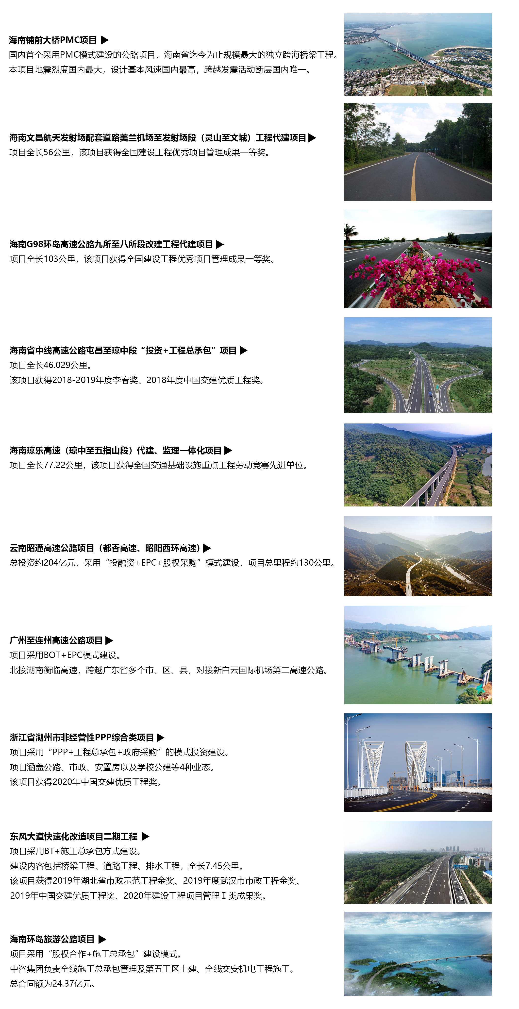 2005年,公司從項目代建開始嘗試和探索項目管理業務,是中國交建范圍內較早開展EPC、PMC、代建監理一體化業務的公路設計企業,截至目前,公司已承擔設計施工總承包和工程管理項目40余項,累計合同額約460億元,項目遍布國內多個省份及海外。